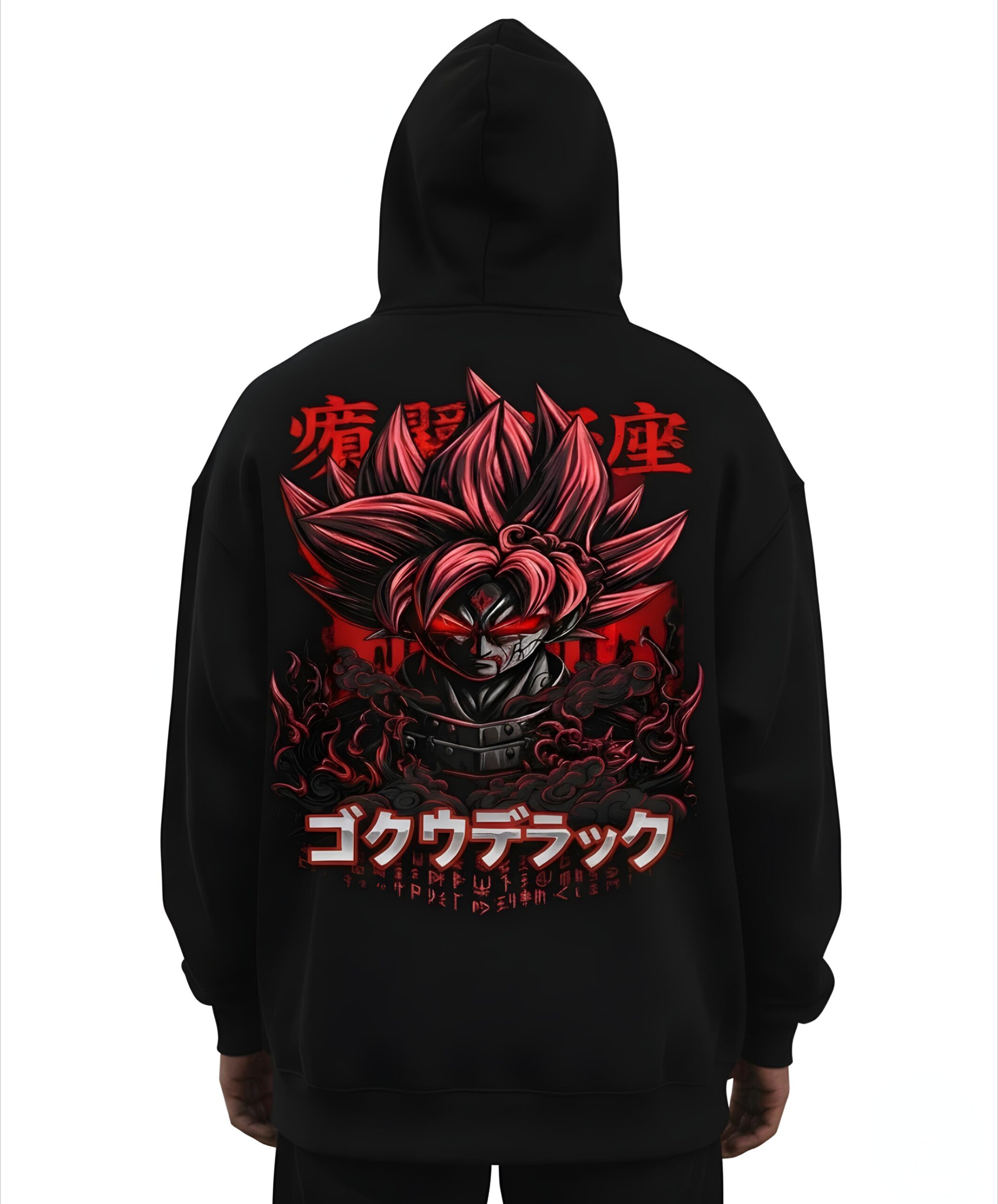 At the center of the design lies a Goku-inspired anime graphic, reimagined through Yaveddra’s signature luxury aesthetic. The artwork features intense red accents, flame-like energy, and sharp detailing that create a powerful contrast against the black fabric. This visual language symbolizes inner strength, transformation, and dominance — values deeply rooted in the Yaveddra brand philosophy. The graphic is bold yet refined, designed to stand out without compromising sophistication.