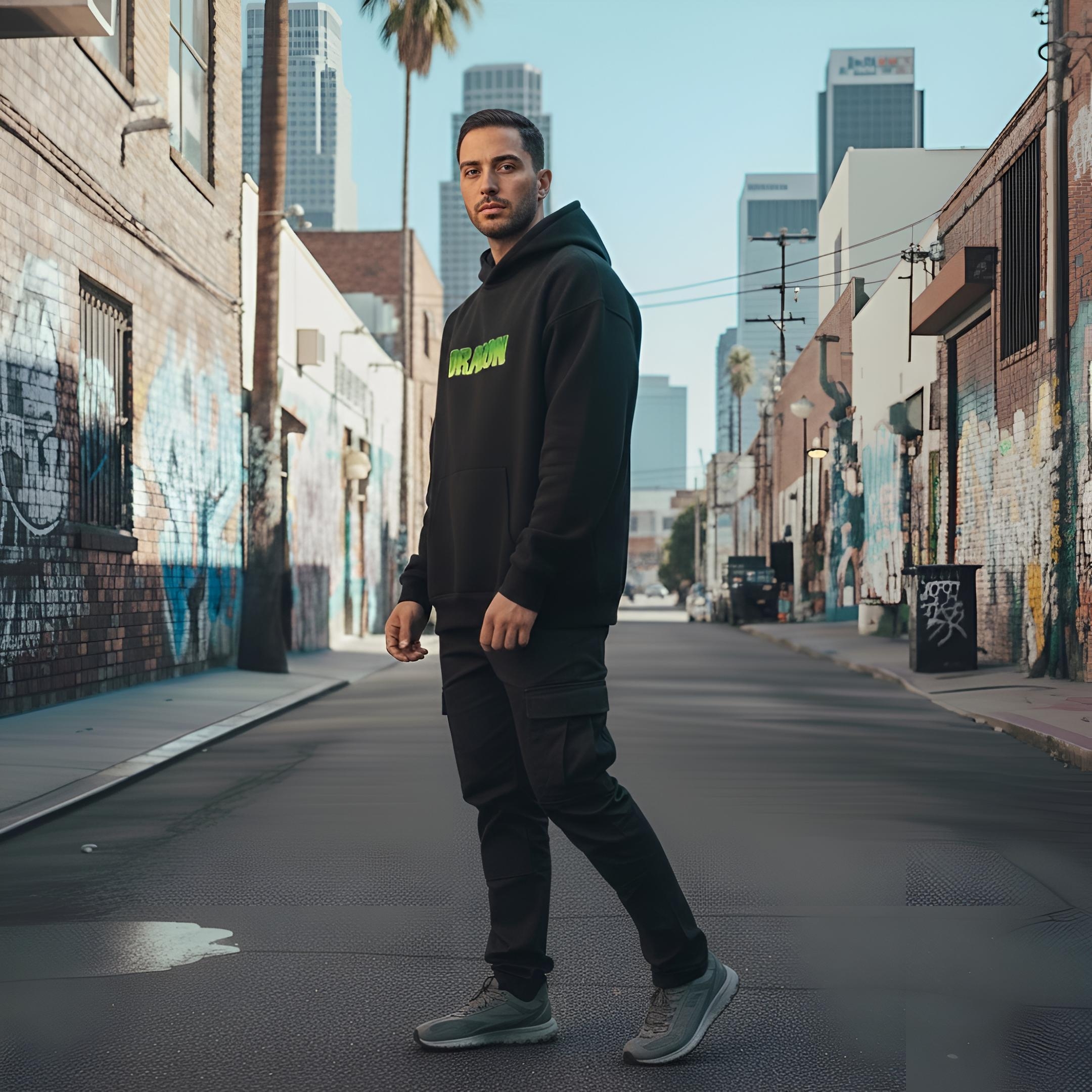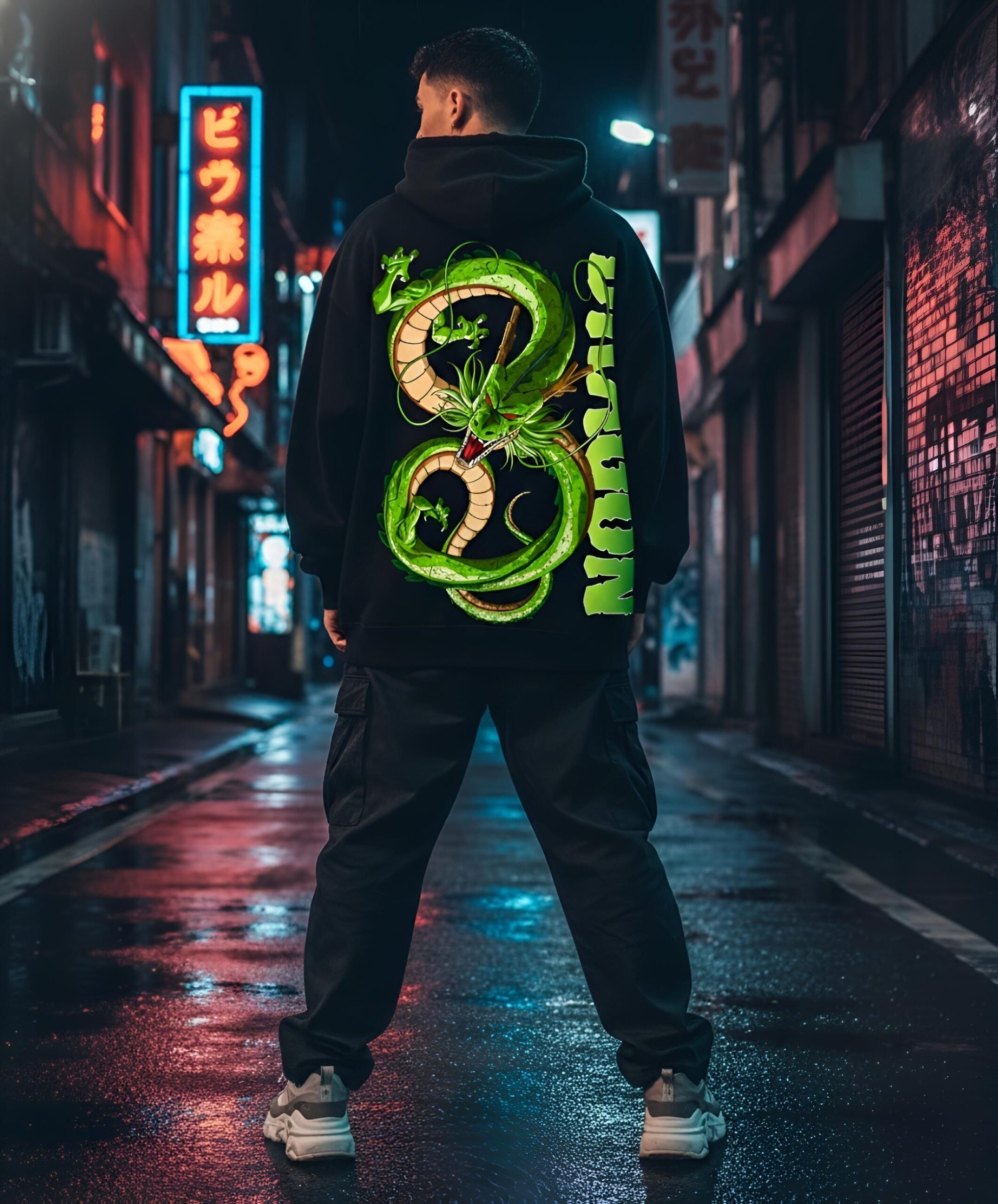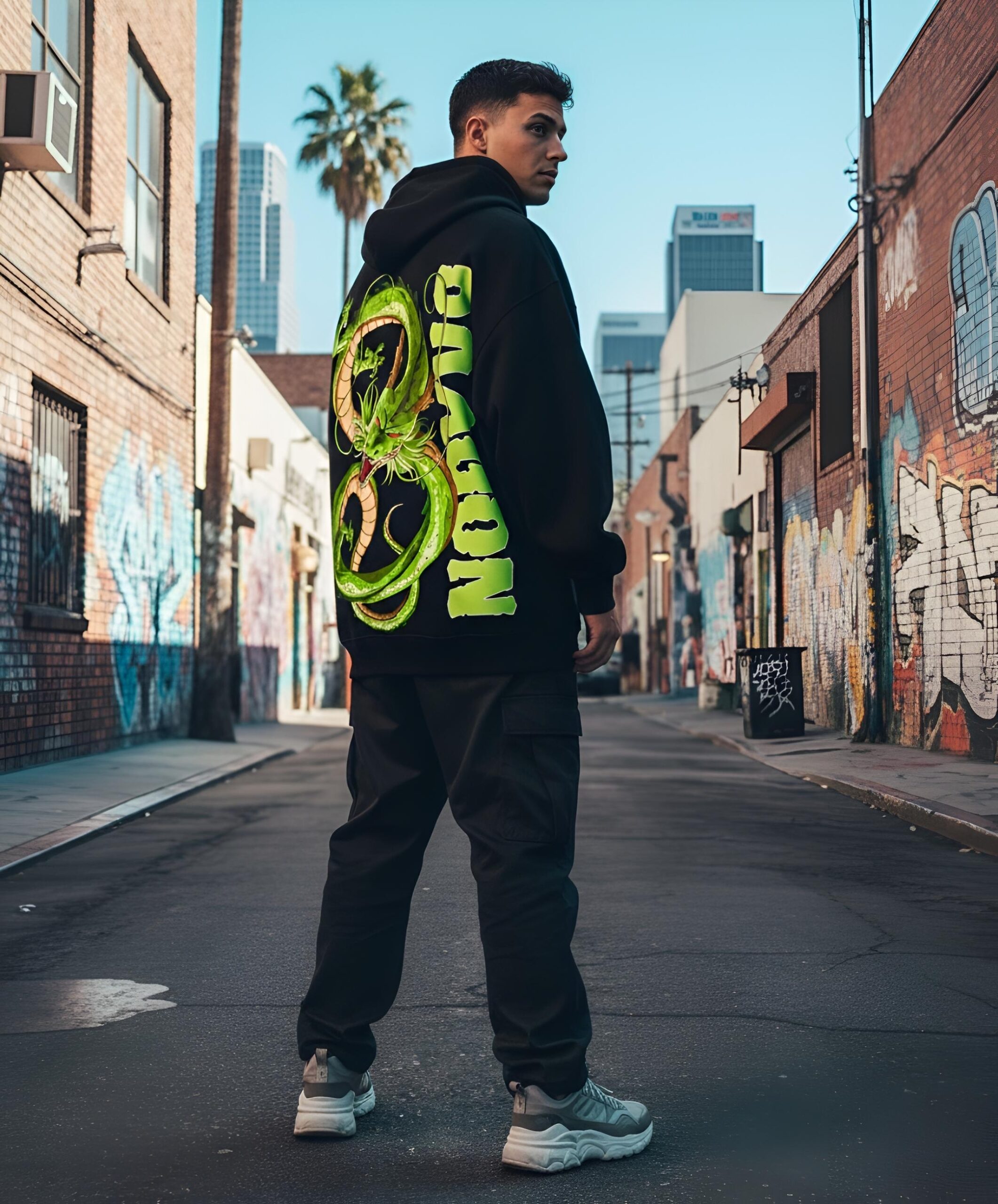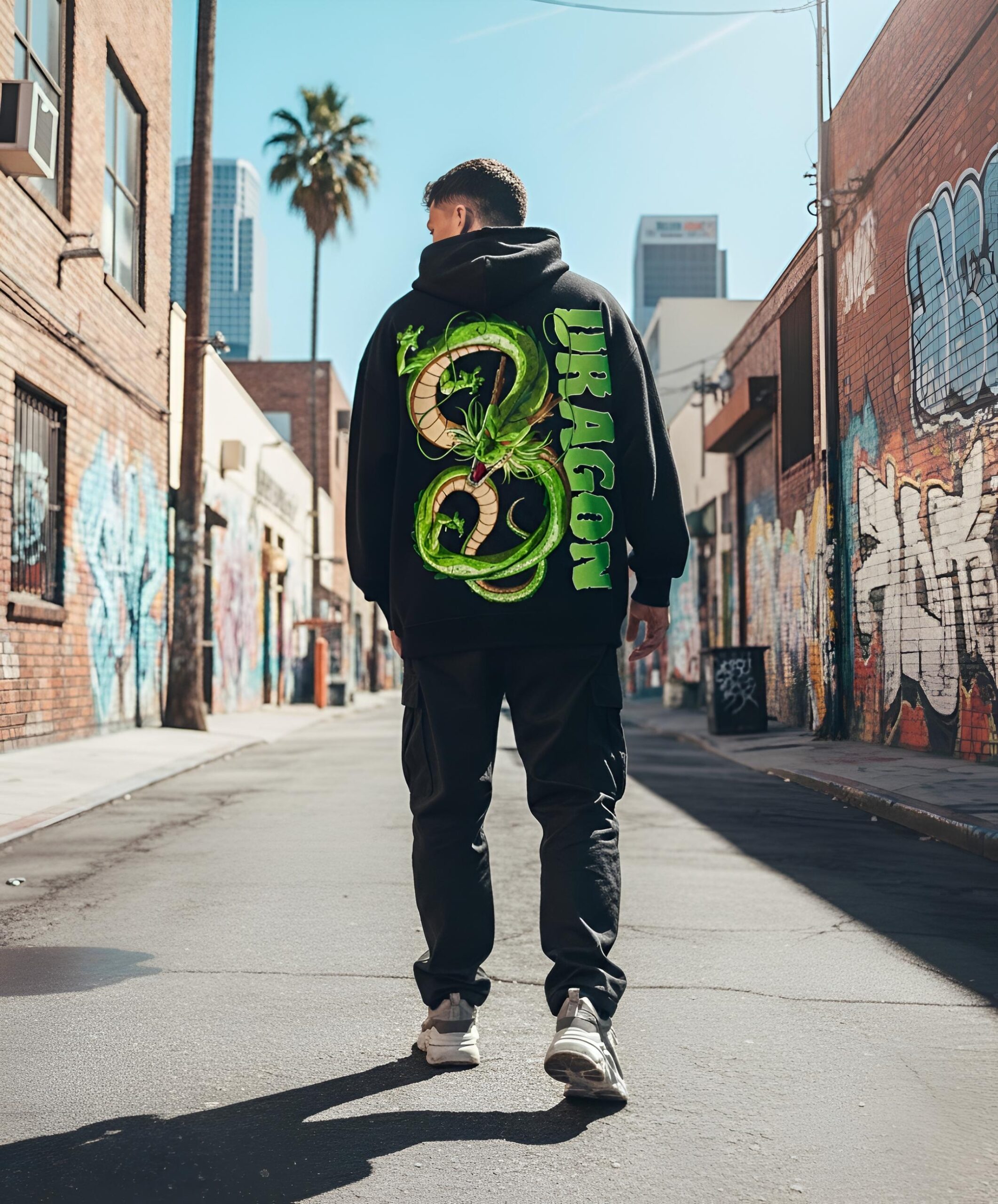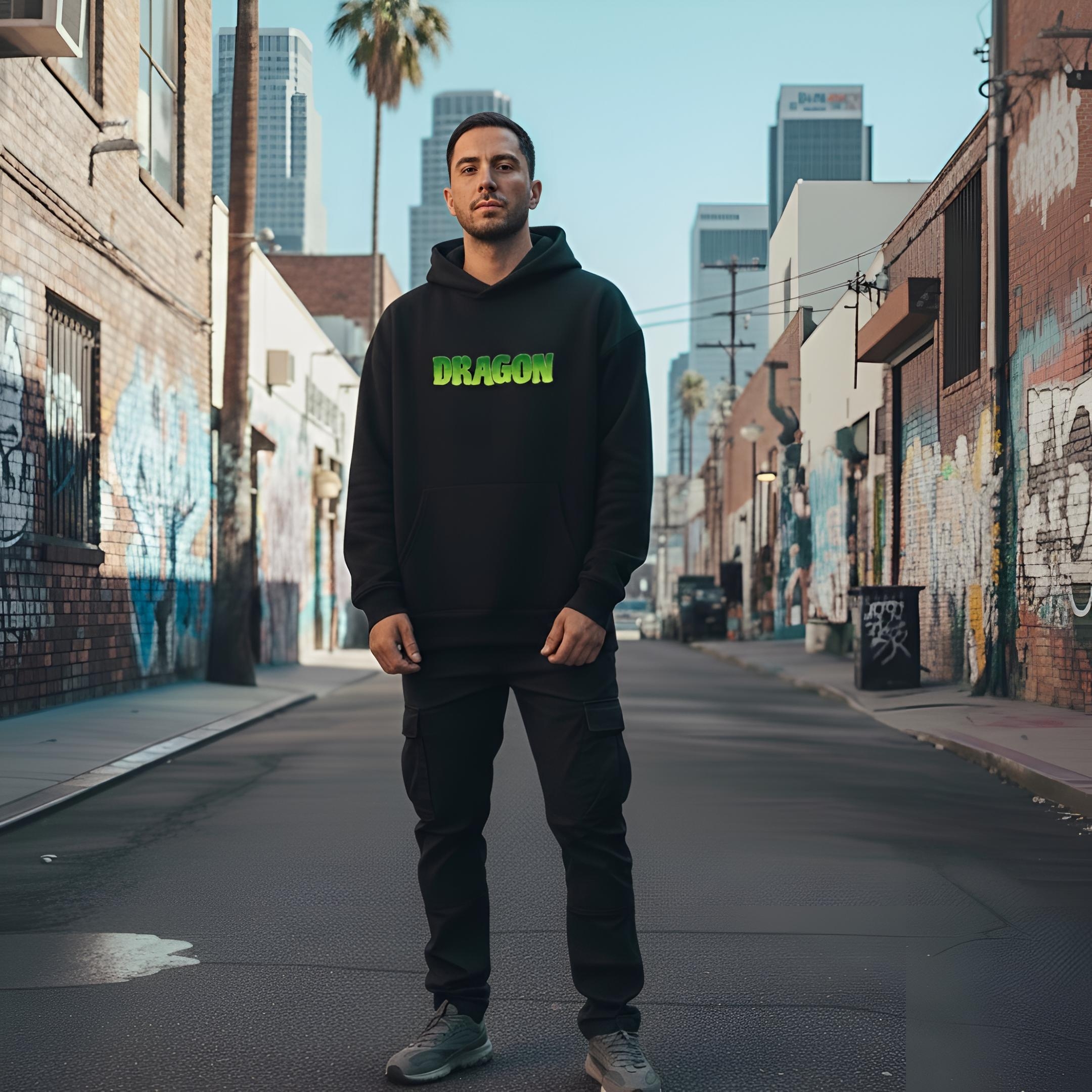 The standout feature of this hoodie is its striking green dragon graphic on the back, symbolizing strength, wisdom, and dominance. Paired with the bold “DRAGON” text on the front, the design creates a perfect balance between minimalism and statement streetwear.