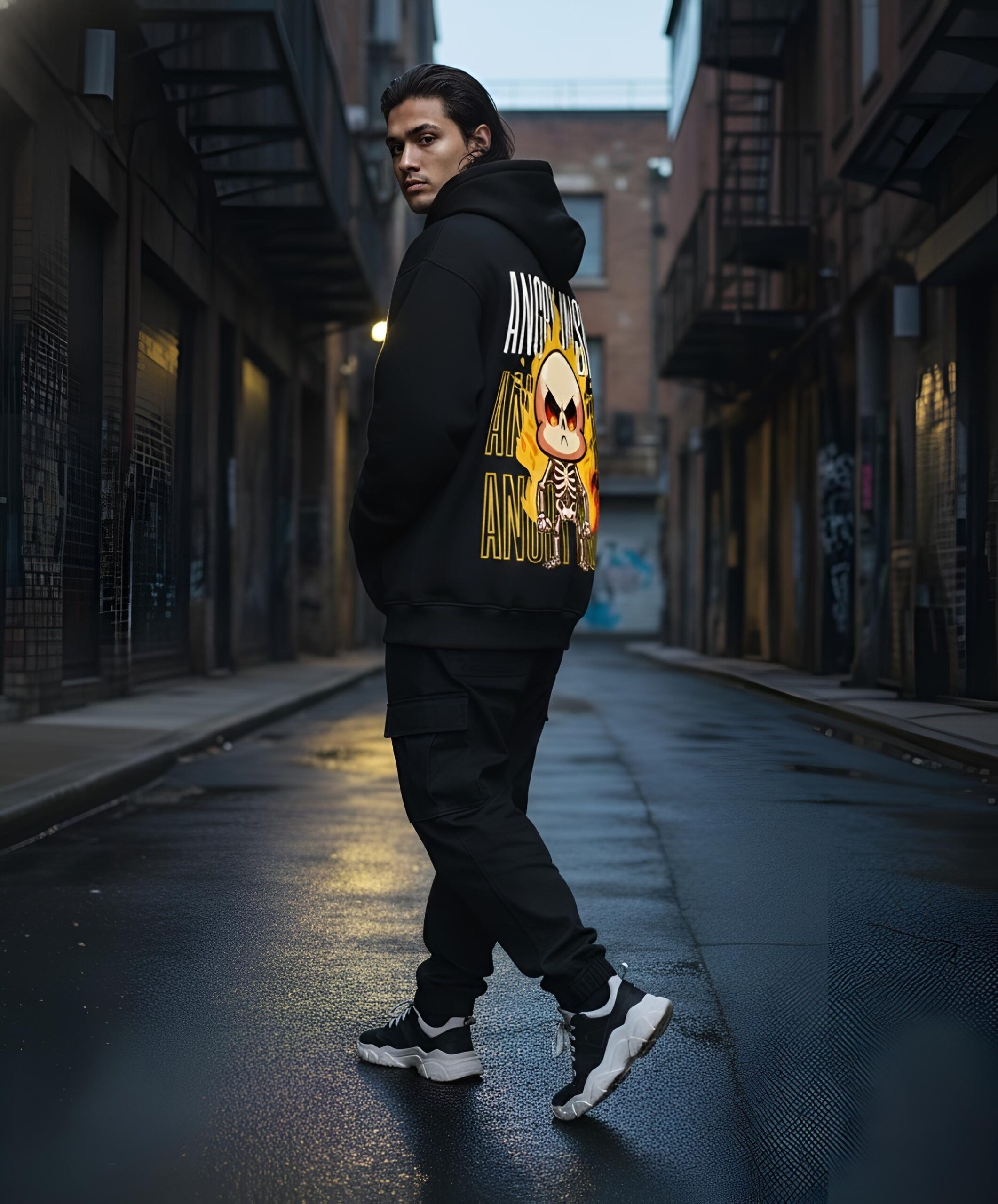 At the back, the hoodie features a premium DTF (Direct to Film) graphic print that delivers sharp details, vibrant colors, and excellent durability. The “Angry Inside” graphic reflects raw emotion, inner strength, and rebellion—elements deeply rooted in streetwear culture. The DTF print technology ensures the design does not crack, fade, or peel, even after repeated wear and washes, giving you a long-lasting premium look.