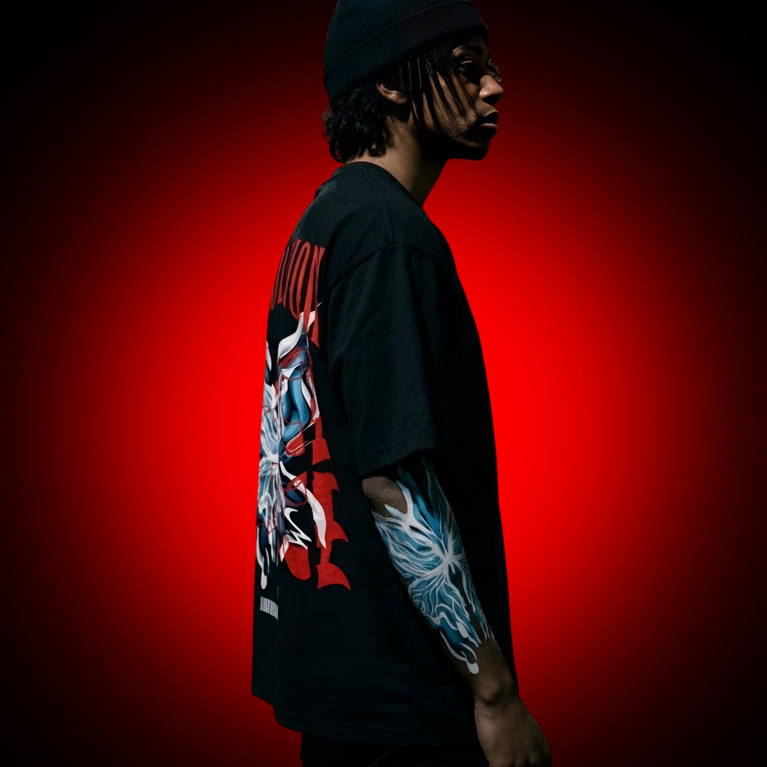 This black oversized t shirt features bold graphic detailing using advanced DTF print technology, designed to stay vibrant even after multiple washes. The premium printed t shirt finish ensures sharp details, long-lasting color, and a smooth texture that doesn’t crack or fade easily.