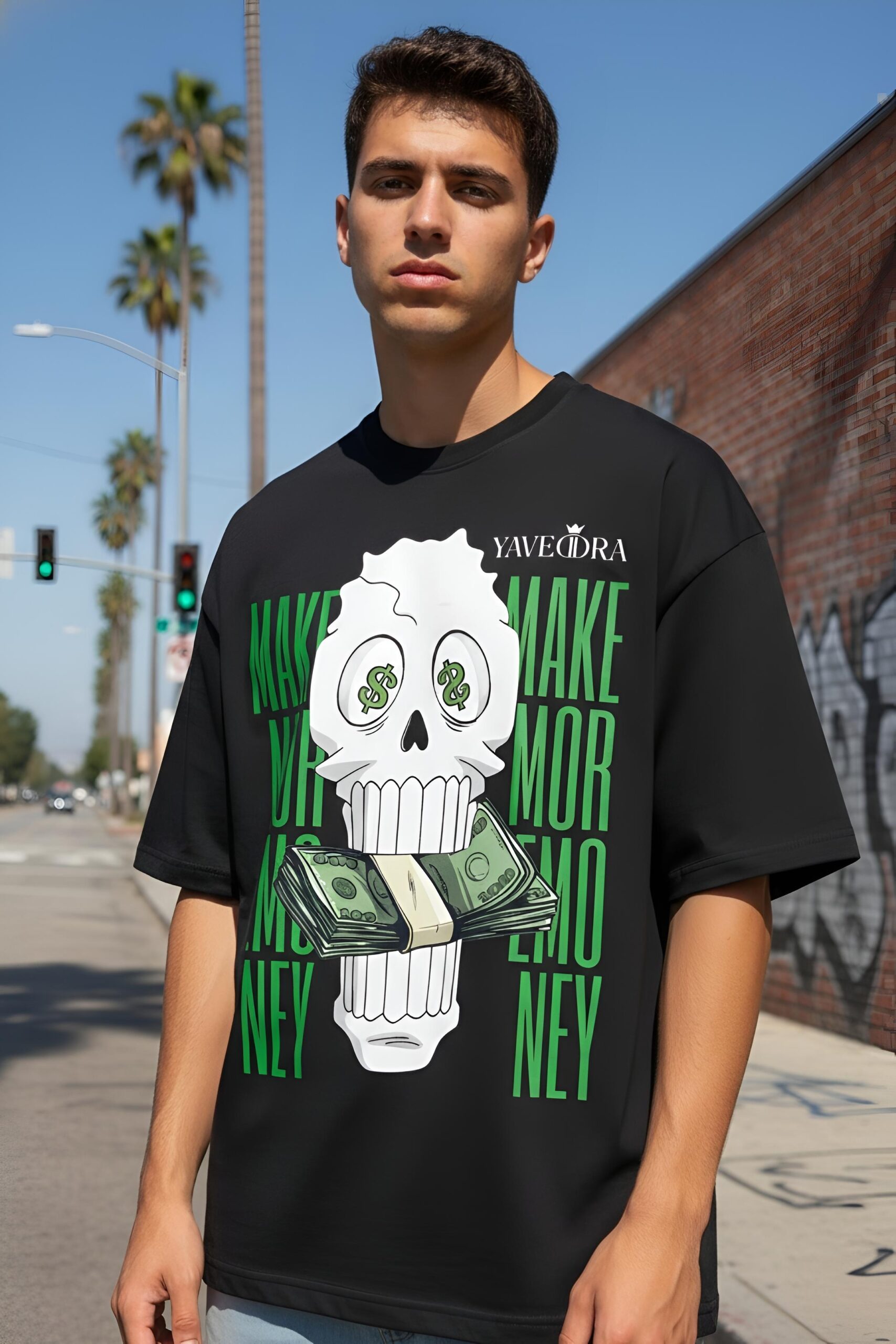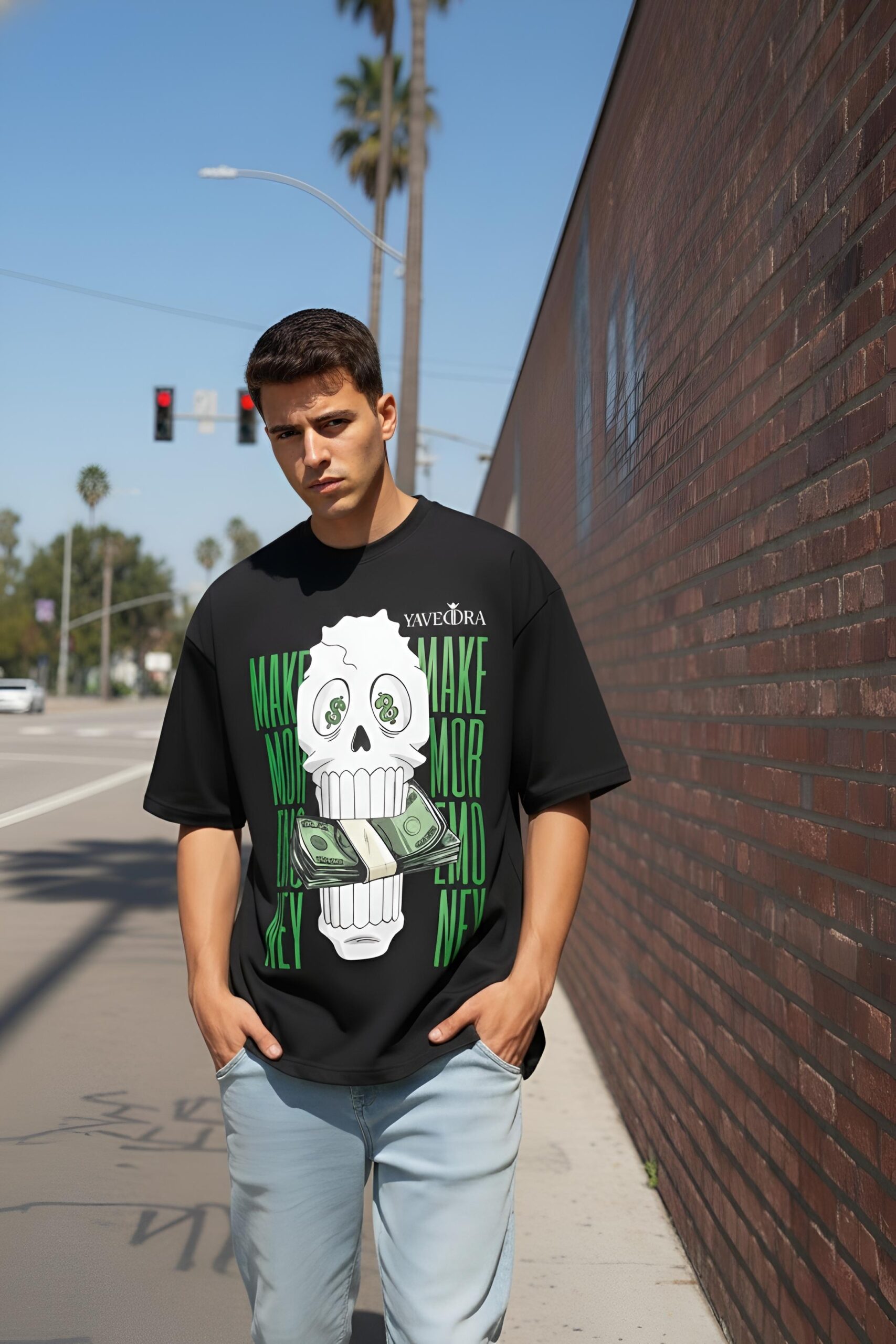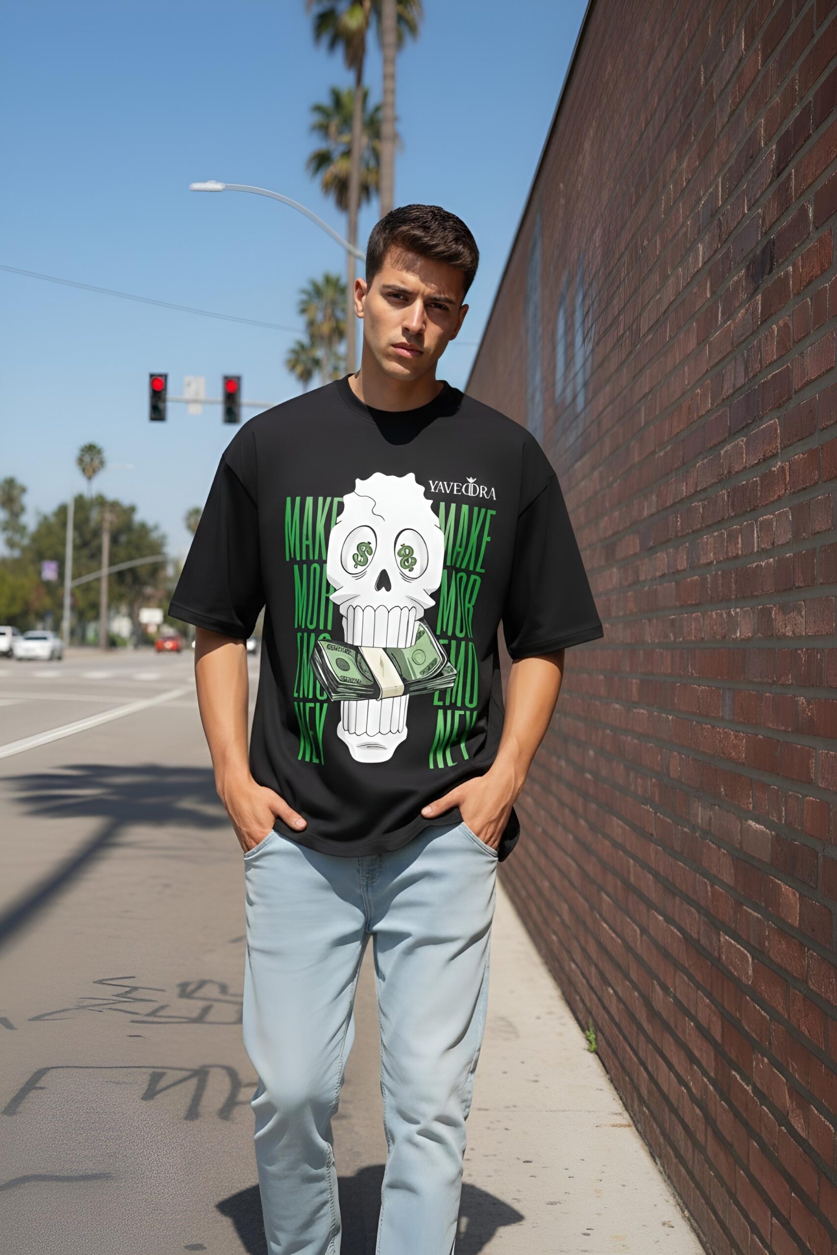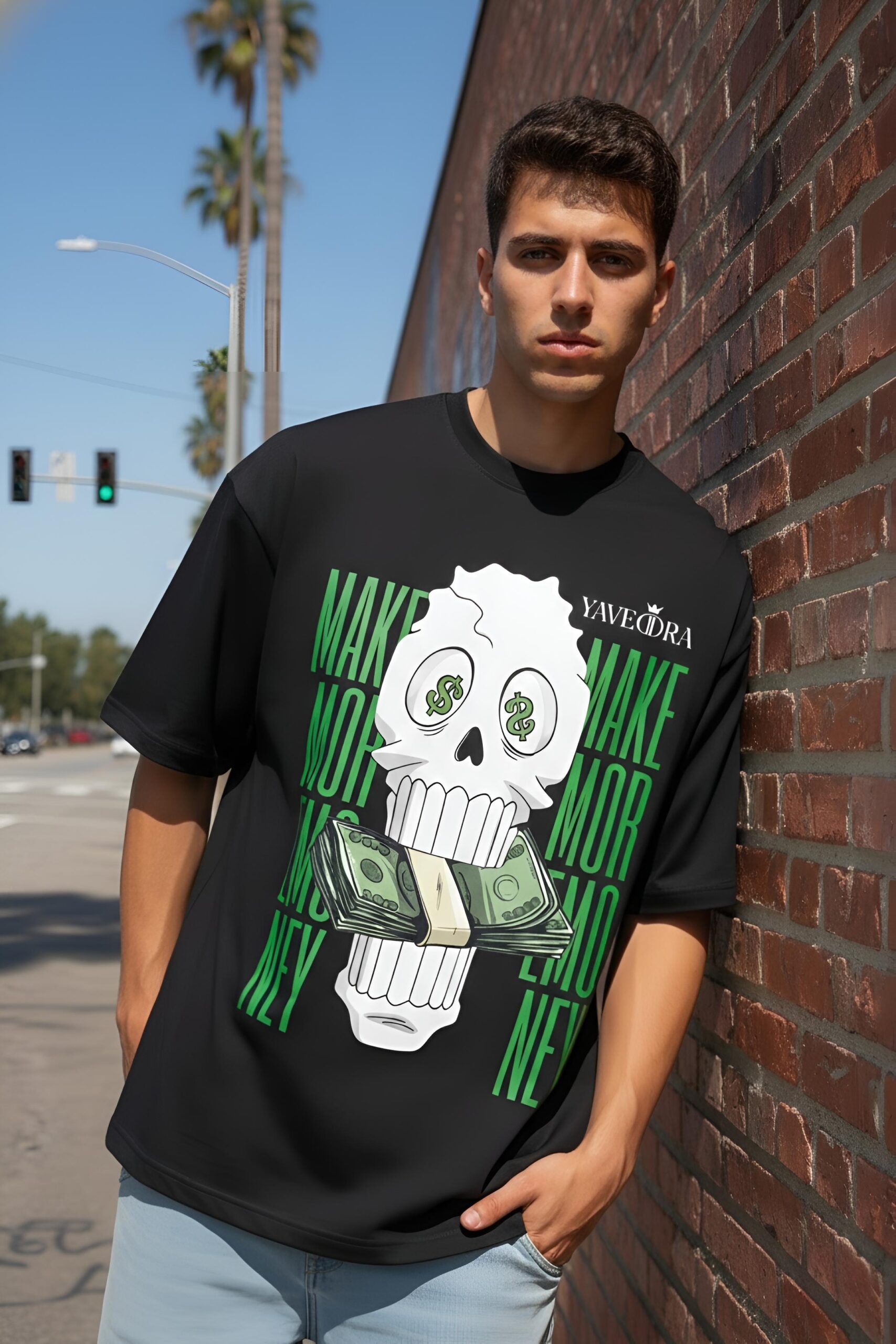 Shop premium money oversize t-shirts by Yaveddra. Features bold skull DTF print, clean back, 260 GSM fabric and oversized streetwear fit for everyday style.
