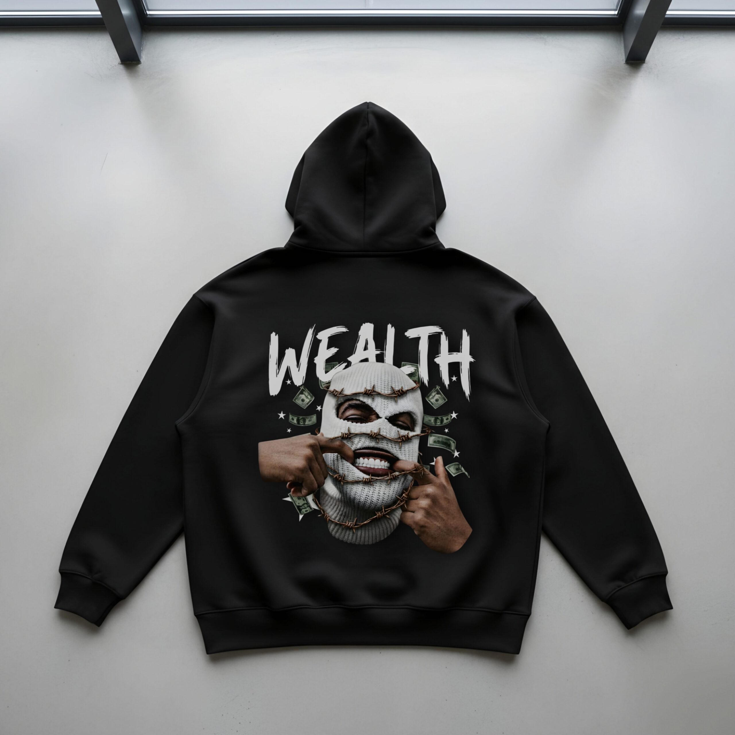 What truly defines the Yaveddra Oversized Hoodie Money Mask Streetwear Graphic is the powerful artwork printed on the back. The design features a masked face being pulled into a fierce smile, surrounded by floating money motifs. This visual symbolizes hustle, ambition, and the complexity of modern success — the pressure, the grind, and the unbreakable mindset needed to rise. Combined with bold “WEALTH” typography, the graphic delivers an unmistakable street aesthetic that captures attention instantly. It’s more than a print; it’s a message, a mood, and a reflection of today’s youth culture.